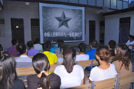 7月15日晚,廣通之家的小院內座無虛席,黃陵縣店頭鎮(zhèn)文化站的同志正在為觀眾們播放紅色經典電影《地雷戰(zhàn)》和《東進序曲》,經典的電影片段不時博得現場觀眾的熱烈掌聲和陣陣歡笑。