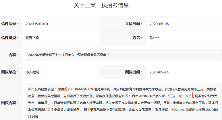 另外,2020年蕪湖市三支一扶計(jì)劃招50人(以下內(nèi)容及截圖來(lái)源于蕪湖市人民政府):