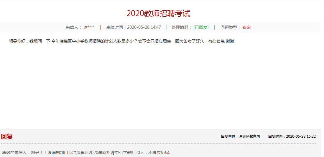 尊敬的來信人:您好!上級編制部門批準(zhǔn)潘集區(qū)2020年新招聘中小學(xué)教師20人,不限應(yīng)歷屆。