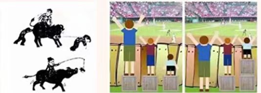 右邊漫畫:左邊是三個人(從左到右身高依次遞減),踩著同樣的方箱趴在墻外看足球場上人踢足球。右邊是同樣場景,但是三個不同身高的人下面踩的方箱依次遞增。對此,你想到了什么?