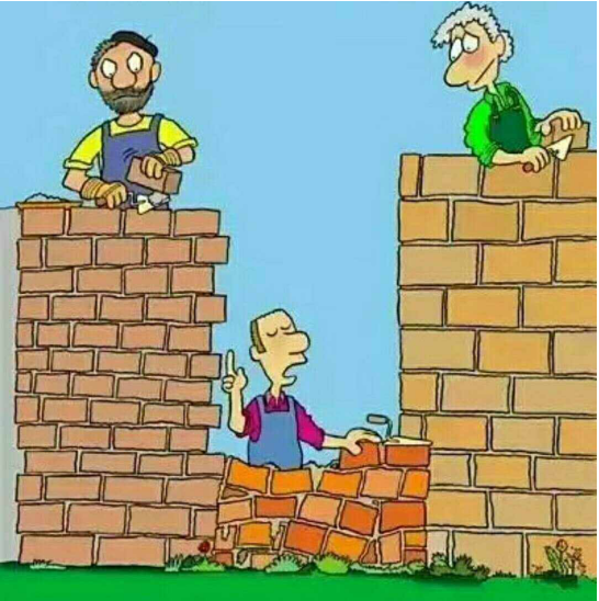 1、漫畫題:三個(gè)人砌墻,旁邊兩個(gè)人都砌得很高了,中間一個(gè)很少,而且磚歪歪斜斜的。三個(gè)人用了大小不同的磚塊。