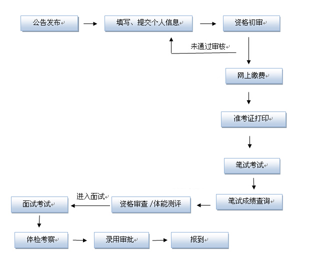 考試錄用工作按照制定錄用計(jì)劃、發(fā)布招考公告、報(bào)名與資格審查、筆試、資格復(fù)審、體能測評(人民警察職位)、面試、體檢與考察、公示、審批錄用等步驟進(jìn)行,由省公務(wù)員主管部門統(tǒng)一組織,有關(guān)工作由各市、省直管縣公務(wù)員主管部門和省直招錄機(jī)關(guān)具體組織實(shí)施。