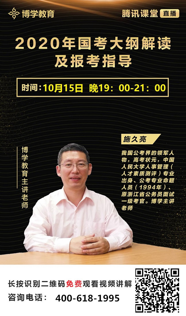 為了提高報名和備考的針對性和有效性,請鎖定10月15、16日晚19:00博學教育首席老師——施久亮老師2020國考報名指導及大綱解讀的騰訊直播課!你想知道的統(tǒng)統(tǒng)都會有,還可以實時互動!